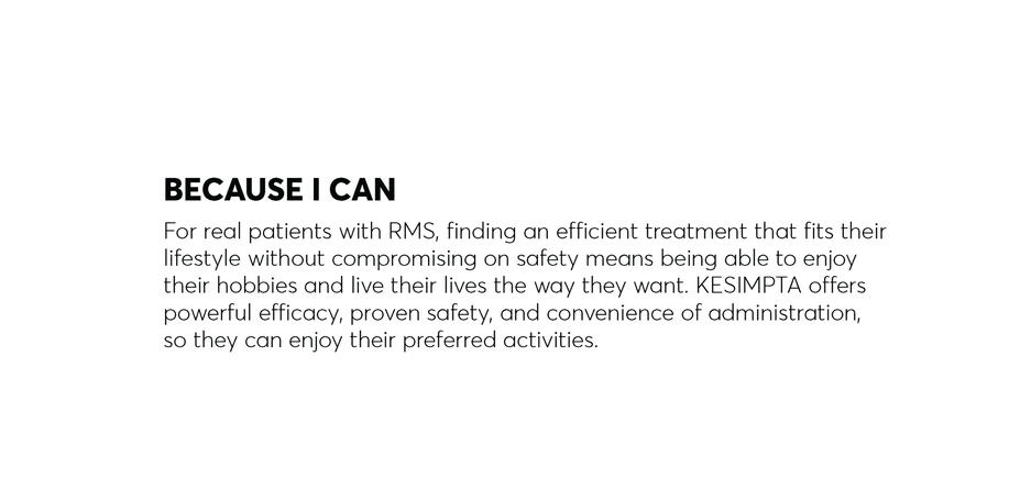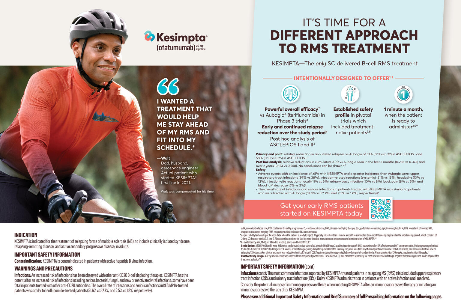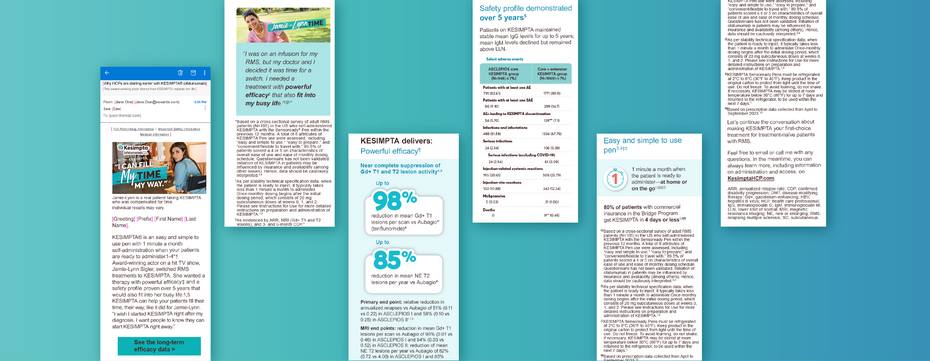 KESIMPTA Concept EvolutionI worked with my long time copy partner, Claudia Serea, on a campaign evolution concept to push KESIMPTA to the next level using real patients. The goal was to get across the idea that these patients do not have to sacrifice anything to get their treatment! No long infusions hours. Just 1 minute a month. I'm most proud of the heights to which we pushed this idea. It was a great experience!